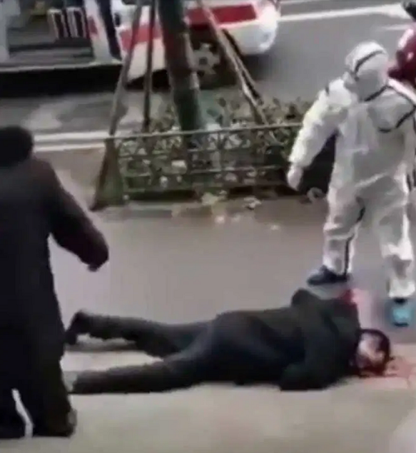 This photos shows a partial image of one of these cremation vans — i.e. “ambulance” in China’s twisted word games — as men in hazmat suits prepare to load up the body of another victim who collapsed dead on the sidewalk and apparently bled out: